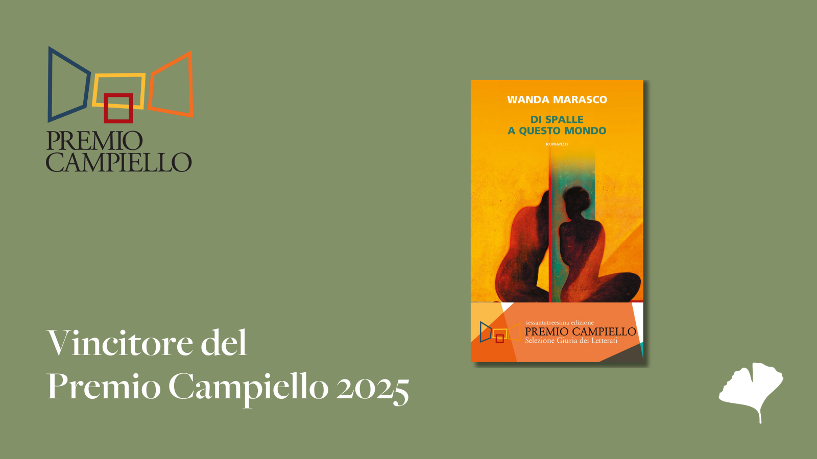 Di spalle a questo mondo (Neri Pozza) di Wanda Marasco vince la 63^ edizione del Premio Campiello, concorso di narrativa italiana contemporanea organizzato dalla Fondazione Il Campiello – Confindustria Veneto. Il libro vincitore ha ottenuto 86 voti sui 282 inviati dalla Giuria dei Trecento Lettori Anonimi.